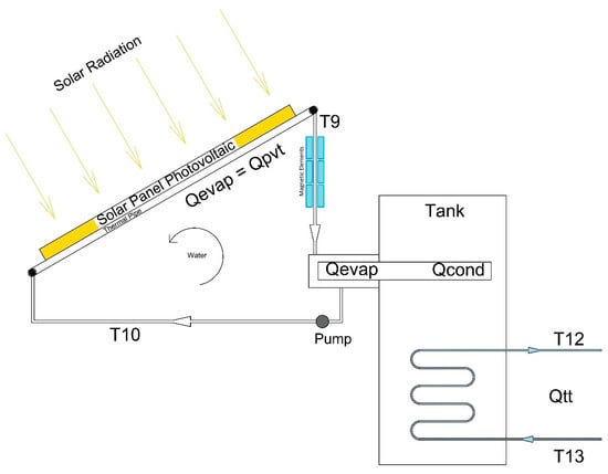 Figure 1 illustrates “the PV-Th integrated solar panel cooled by a water-based nanofluid that was analyzed and numerically modeled in this research work under the influence of magnetic field force. This integrated hybrid system consisted of a photovoltaic solar panel and welded thin parallel tubes on its backside for the circulation of the heat transport fluid with nanofluids. The parallel thin tubes were soldered to the PV solar panel and connected to a thermal tank from which water-based nanofluids flow through the solar collector copper pipes and carry the excess heat away from the PV–thermal panel as shown in Figure 1. The excess heat released by the PV solar panels was transferred to the evaporator section of the heat pipe and released by the condenser section of the heat pipe in the thermal tank”.