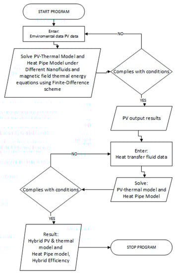 This paper presents “the governing equations for a simulation model of a photovoltaic–thermal solar panel hybrid system operating with nanofluids and under the influence of a magnetic field. The novel concept presented in this paper uses magnetic field forces to enhance the energy conversion efficiency of the PV–thermal solar hybrid system and utilizes excess thermal energy dissipated in PV solar panels to drive heat pipes to produce hot water for domestic hot water (DHW) and/or thermal industrial applications”. The conceptual photovoltaic–thermal panel characteristic was modeled and analyzed using a two-dimensional dynamic model based upon the heat transfer and fluid flow conversion equations. The model was developed to describe “the steady-state and dynamic behavior of a combined photovoltaic cell–thermal panel hybrid system under different solar irradiances, nanofluids, magnetic field forces, material properties, ambient conditions, heat transport fluid flow conditions, and excess thermal energy recovered by the panel. The predicted results presented herein include the thermal efficiency of energy conversion of the hybrid system, PV cell, and the amount of excess thermal energy recovered by the panel and transferred to the fluid transport flow under different conditions”. The improvement of efficiency due to magnetic fields in solar energy usage would contribute to decreasing the environmental limits on the application of the solar heater in a wide range.