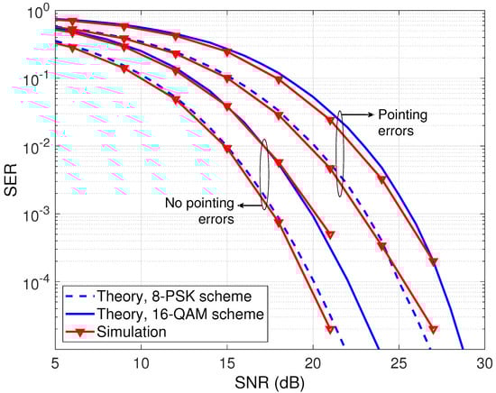 - Trung, H.D.; Tuan, D.T. Performance of free-space optical communications using SC-QAM signals over strong atmospheric turbulence and pointing errors. In Proceedings of the 2014 IEEE Fifth International Conference on Communications and Electronics (ICCE), Danang, Vietnam, 30 July–1 August 2014; pp. 42–47. [Google Scholar]