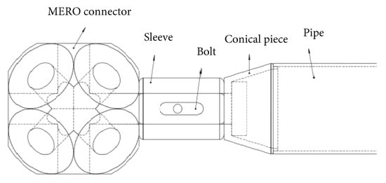 The growth of human population has led to an increasing need for large spaces without the presence of middle pillars, such as community halls, passenger terminals, factory halls, sports stadiums, and recreational and cultural centers. Space frame structures are used in order to cover large spans without columns in these spaces. The term “space frame structure” refers to a structural system which is created from a large number of members (modules) connected to the standard parts, creating a lightweight system with high rigidity [1]. In other words, space frame structures are a set of repetitive components including rods and nodes, through different arrangements out which various 3D shapes can be generated [2]. The term “MERO” is derived from Mengeringhausen Rohrbauweise, which is a German term for a tubular structure [3]. In a MERO space frame structure, which was first designed and commercially marketed by the MERO Company in 1942 in Germany, the main components include ball (MERO connector), pipe, conical piece, screw or bolt, and sleeve, as shown in Figure 1 [4].