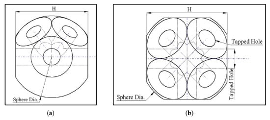 In double-layer joints, four screw holes are located on a base plane, which is similar to the MERO single-layer joints. In addition, four holes located in planes inclined to the center of the ball with an angle of 45° to the base plane allow for four new links to be connected to the MERO double-layer ball joint. In the present study, the outer diameter of the MERO ball joints considered in analyses are 98, 110, and 132 mm for which the distances between the caps (H) in the first layer of the ball joints were regarded as 85, 98, and 118 mm, respectively. Figure 2a,b and Figure 3a,b illustrate the dimensions and geometry of the MERO ball joint.