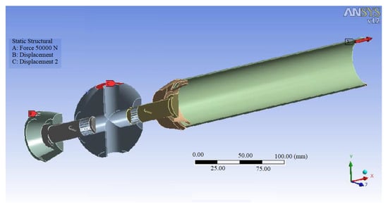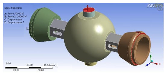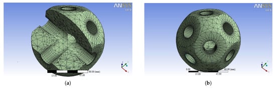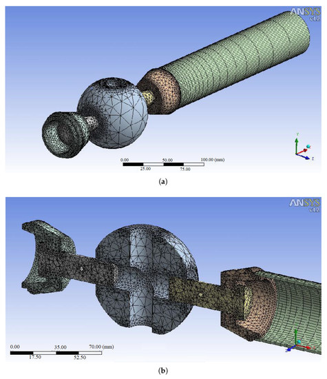 Modeling, analysis and grid generation of the ball joint were conducted in ANSYS Workbench v.14.0. Solid-type element SOLD 45 was used for modeling the ball and grids were created carefully at the screw joint surfaces. Materials were modeled as isotropic with constant modulus of elasticity as E = 200 GPa. Further, the inflation option was activated in the holes and at least five grid layers were created near the holes in order to increase the accuracy of calculations, along with reducing the grid size. Grid generation has been shown in Figure 4a,b. Grid of the whole system modeled in ANSYS has been shown in Figure 5a,b.