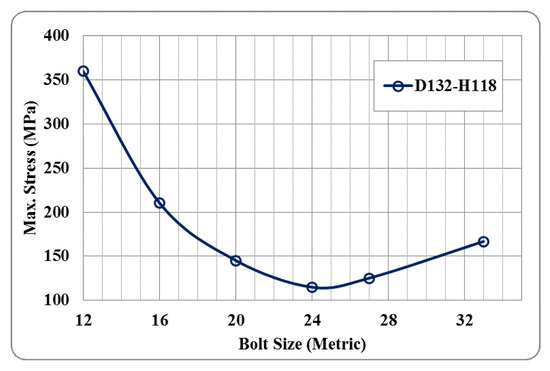 Effect of the ball joint sizes with diameters of 98, 110, and 132 mm for each screw size on the maximum stress level can be compared for the considered three screw sizes of M12, M16, and M20.