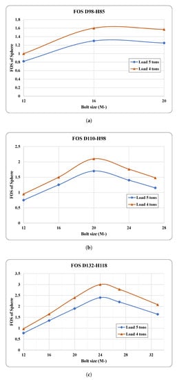 As represented in Figure 17a–c the amount of the FOS is enhanced by increasing the diameter of the ball joint under the considered loading conditions and screw sizes. The highest FOS belongs to the ball joint of 132 mm for screw M24 under the axial load of 4 tons. In addition, these figures show that FOS has roughly a linear and reverse relationship with the amount of the applied load. It is noteworthy that M12 screw size is not recommended for the loads more than 4 tons, since as apparent from above figures the corresponding FOS would be very low and almost below 1 in all the cases.