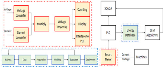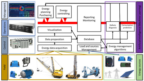 Figure 7 shows the general subsystems of a SEMS that can be implemented in industries, typically chemical processing and the mining industry. The data management subsystem collects energy consumption and generation data and runs the regressors to forecast the energy profile and demand then uses the classification algorithms to diagnose the system, detect abnormal consumption and anomalies and predict critical grid failures [8,13].