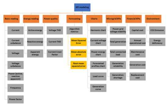 The monitoring of the electrical grid requires several types of data to be precalculated or acquired from sensors. As shown in Figure 8, these data are classified as basic readings, energy reading and power quality which are directly alimented by the power meters, and the forecasting algorithms of the energy demand response which are based on data collected and stored in the database.