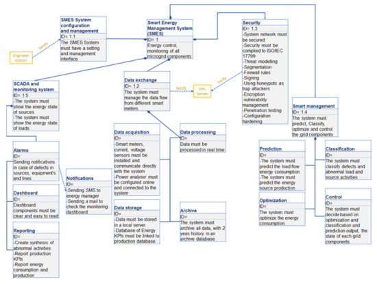 The requirements diagram shown in Figure 9 sums up the requirements for a smart energy management system considering five important parts: SCADA and the monitoring system which contains alarms for sending notifications in case of a defects or an abnormal behavior of the grid components, a dashboard that shows the different KPIs and results of the microgrid, and a reporting system that summarize the results and generates reports automatically. The data exchange between different smart meters, power analyzers and the communication system, where the data acquisition processing and storage must be in real time and automatic.
