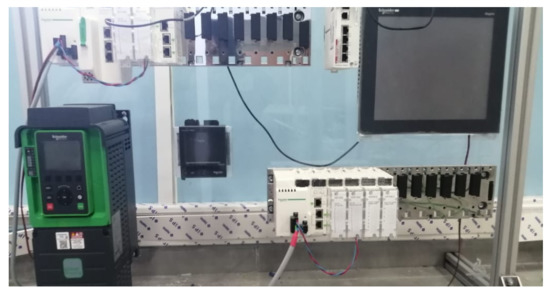 After studying the existent SCADA architecture in the field, we designed a prototype of the control system, using a Modicon M580 PLC, an MP8000power meter, a squirrel cage induction motor with a variable frequency drive. The PLC uses a wifi module to share data between other deported PLCs. Figure 19 represents the test bench adding an HMI to visualize the data. The program is tested and built on the same PLC using Unity pro XI software.