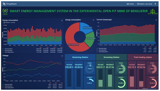 In this section, we have chosen two types of views for operators and field engineers, using Citect SCADA software and the ThingsBoard solution for the energy manager, where he or she can visualize all data and download reports without accessing the SCADA system. Figure 20 shows the ThingsBoard for web browser access. This view is under design. The communication with the database has been done successfully; however, the implementation phase in the open-pit mine has not been done yet.