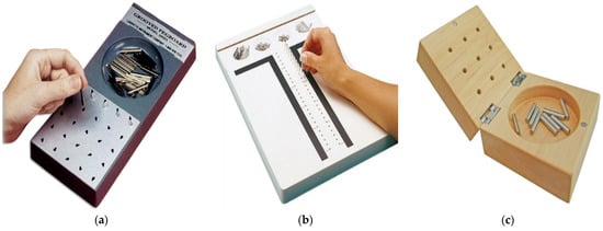 Three examples of different types of Pegboard Tests: (a) Grooved Pegboard Test (GPT), (b) Purdue Pegboard Test (PPT), and (c) Nine Holes Peg Test (NHPT).