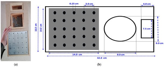 The image (a) is the external look of the proposed pegboard and its geometrical dimensions (b).