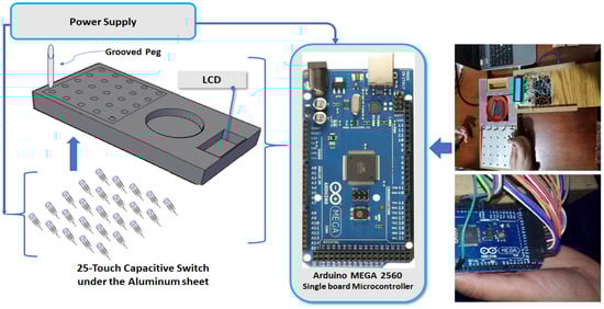 The electric circuit consisted of a microcontroller (i.e., Arduino MEGA) and a liquid crystal display (LCD), as shown in Figure 3. The Arduino MEGA is a single-board microcontroller with 54 input/output pins. It has its own programming language (i.e., Arduino software), permitting the design of electronic projects and systems for various applications. It is equipped with a USB cable port to transfer code from the computer to the board. The detailed structure and specifications can be found in ref. [27]. A matrix of 25 switches is mounted under the aluminum sheet, so there is an electronic switch under each hole. The experiment employed the Stainless-Steel Capacitive Switches type CPS16B (Langir Electric Co., Zhejiang, China). Each switch is 16 mm in size and requires a 5V DC power supply. The microcontroller, which can be mounted under the aluminum sheet, receives an input pulse signal from each switch via an electric wire. Thus, there are 25 wires, one wire under each hole. Once the participant places the peg in the correct hole, the electronic switch becomes “closed” generating a pulse signal sent to the Arduino board. The microcontroller was programmed to calculate the elapsed time between the first and last peg. The result was displayed on the LCD screen. The power supply was drawn from a computer laptop. Figure 3 shows images of the electric circuit and the circuit block diagram.