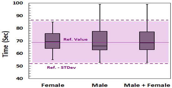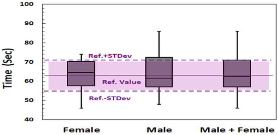 Table 2 shows the experimental results on 40 normal people who are 20–29 years old. The AVG ± STD of measurements from dominant hands was 63.2 ± 7.6, 64.0 ± 10.5, and 63.6 ± 9.1 for female, male, and all participants, respectively. These values approached the population AVG and STDev values, which are 63.4 ± 7.9 s (Appendix A) in reference [13]. Similarly, the AVG ± STDev values of the measurements from non-dominant hands also come close to those of the population values. Therefore, the measurements on dominant and non-dominant hands comply with the population mean value that is reported from the manual GPT device [13].