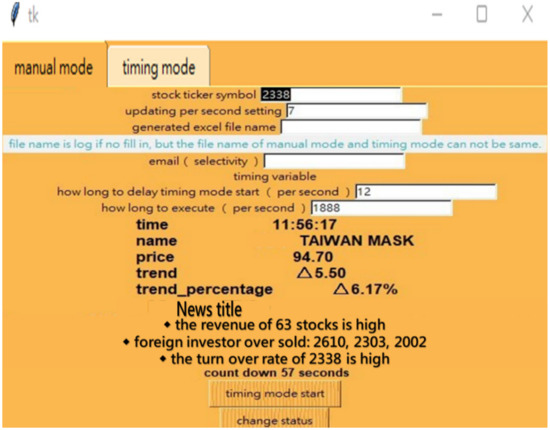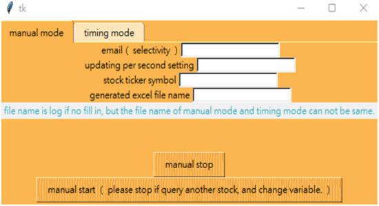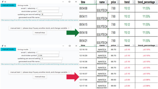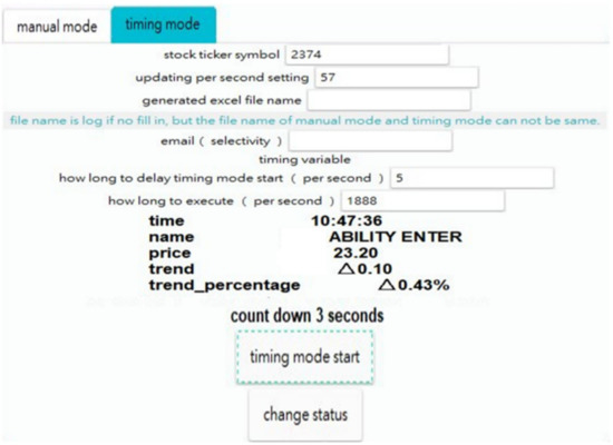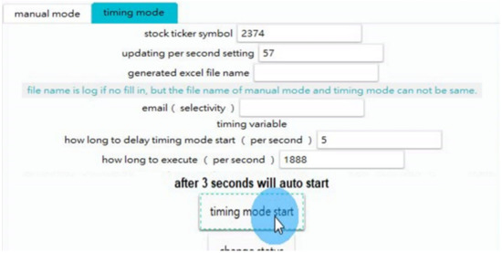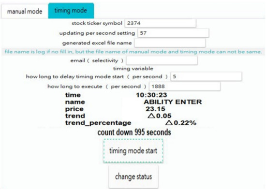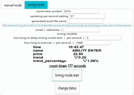 Figure 1 and Figure 2 are the application GUI of the proposed method that is implemented and designed. The GUI tab shown in Figure 1 is called manual mode. The GUI tab shown in Figure 2 is called timing mode. The manual mode only texts into the stock ticker symbol, updates the per second setting, and it allows the user to change the Excel file name and email, and then the manual mode tab will display the stock price of these companies. The timing mode texts into extra timing and prior variables, and then shows the stock information, as shown in Figure 2.