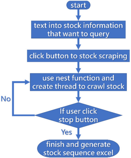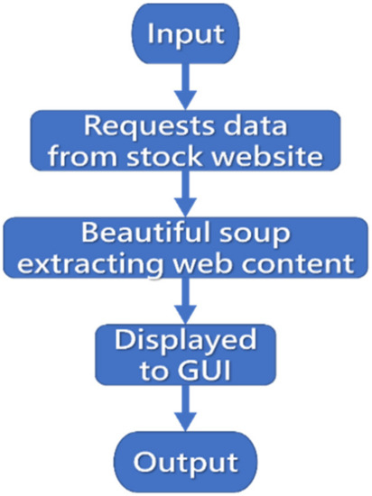 When the prior tools, regarding the beautiful soup, that extract website content and the request urlopen() function are introduced, completed and otherwise, the process successfully crawls the stock data. However, there is a problem. If the GUI is used to display the stock scraping results, there is an issue that must be solved. Because the Python GUI regarding the tkinter is a single thread that only maintains the GUI window, if it creates another new task, such as clicking the button to scrape the stock price, it will bunch to the original thread mission that holds on the GUI surface. Therefore, the solution to deal with it is to create a new thread to take the target of the start button function, such as a stock-tape-reading event, and also design the stop button to break out of the scraping task; or, an alternative solution is a stock-crawling endless loop that cannot stop the attack on web scraping source website. These flow chart concepts are shown in Figure 8. and try again demonstrate the input and output with the flow chart type as Figure 9.