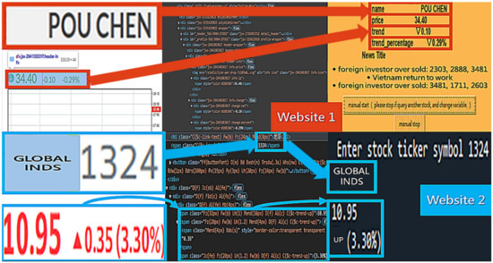 With the example of crawling stock prices, there are two possible website sources. The first is website 1, the stock service website called Anue, and another, website 2, is the Yahoo stock website in Taiwan. The proposed method will crawl the company name, stock price of the company, stock trends, and stock price fluctuations. However, the problem of the Yahoo stock website is that stock price fluctuation data are not related to any span block or element. Scraping stock information from Yahoo is difficult, and the request limit of the programmable scraping of the Yahoo stock website is low. The prior concept will transfer to display in Algorithm 1.