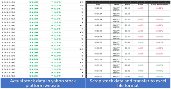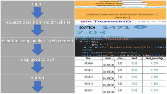 In the Taiwan stock market, there is a jargon term called tape reading, and its service user surface is for day trading users. Day trading is a strategy for short-term investment, that is, to gain the stock benefit with stock price float-up and -down trends on the same day, but not to care for market development. The definition of day trading is not equal to that of traditional exchange. Day trading users and these concepts focus on stock price behavior in one day, not the company’s ability to influence long-term corporate stock prices. Thus, tape-reading users require numerous stock sequences that are of a better type, such as the Excel format, rather than the current stock service website, such as Yahoo and Anue’s limited reload stock sequence and stock fundamental figure. The challenge of this application is that the reload period of stock prices is limited in Yahoo and Anue and these stock platform websites only reload at 9:00 a.m. on that day. The time stamp of stock prices in Yahoo or Anue is not flexible. Thus, this study will deal with this challenge, as this study application can freely select updating stock price time for 30 min, solve the nonflexible stock price time stamp problem in Yahoo and Anue, and record stock prices using this proposed method to face the difficulty of limited stock prices reloading. When designing such a system as this, we will face the technical challenge of establishing so many tabs to scrape enormous amounts of stock price data that the user wants, and a problem as in the recycle program application may occur; thus, it must be used for an object concept to create tab instances to effectively and robustly trawl the stock price. To compare with existing approaches, the proposed method adds the feature of sending stock sequences back to the user’s email, which is better that the existing Yahoo and Anue services, and it provides a more flexible stock timestamp. There are many day-trading users in Taiwan who want to use this tape-reading method to earn stock price rewards on the day in a short schedule. The tape reading surveils the stock price of some companies that have stock ticker symbols, and then records the stock price in a possible note method. In addition, the observing method of noting stock prices may be television or stock exchange. The interval time step of recording stock price varies according to every stock user’s experience and their theory may require them to record every 2 min, 3 min, 10 min, half an hour, 2 h, etc. As an example, the Taiwan stock market starts at 9:00 a.m. and closes at 13:30 p.m. It has a 4 h operating time if it contains board lot time after 13:00 p.m. Splitting the 4 h operating time for tape reading is the skill of stock users. The stock price sequence generated by tape reading can be predicted by stock users, such as tape-reading users, a concept similar to that of Tiwari et al. [1]. However, it is the stock user’s experience. This study proposed a tape-reading method with web scraping using a thread structure. This method can periodically scrape the stock price of a company that the user wants to query and must have a format stock ticker symbol; this method then generates the company’s stock price sequence in an Excel format. This application can satisfy the demands of some stock users, who are called tape-reading users. Because these tape-reading users want to gain stock price sequences minute by minute, rather than the stock exchange format of day by day, these users think that the minute-by-minute stock price sequence is very clear to forecast and also better than Anue or Yahoo and other stock search websites’ stock sequence, which have no regular minute frequency. The proposed method implemented a prior scheme and designed the GUI to search and query companies’ stock prices. In addition, the proposed method can also scrape the stock news of some companies as an extra feature while simultaneously querying the stock price sequence of these companies. It can simulate these stock users’ searches and obtain some of the companies’ stock, and a bonus gain is the stock news of these companies; and according to the stock news regarding the good or bad information about these reflected companies, such as Zhao et al. [2]; stock users can use this gained stock news as economic suggestions to forecast the stock price up and down movements of these companies. These prior scenes can simulate and modify the application scheme. The GUI that this research designed can even set a per-second setting, and so on, how long between stock price updates, and a time-up feature to stop scraping stock prices if the user just wants to scrape stock prices periodically. This research method additionally designed and added email-sending features. This feature simulates stock users finishing scraping stock prices and tape reading to transfer stock price sequences as Excel files, and they can send stock price sequences in Excel format to their email as backup. In this email-sending application scene, some stock users in the other place are strangers on the device, and then stock users use the stock scraping with a tape reading service proposed in this research. However, the stock price sequence generated by this service will save the device as an Excel file. If it can send a stock price Excel file to stock the user’s email, then it is a system such as the concept of cloud backup checking. This research will provide a solution so that stock users can freely and selectively send the generated price sequence back to their email. As such, it is convenient.