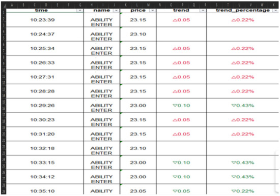 As the prior experimental results demonstrate, the operation step of the application GUI is the first entry stock ticker symbol that is to be queried, and the number of seconds to update and show the stock price and stock trend. Otherwise, the generated stock Excel just as Figure 16. And the Excel file name that it wants to call, and the selectivity email when the tape is read, are sent to the user’s email. In addition, the timing mode has the same meaning as the prior manual mode, and the execution time of tape reading and the delay time of tape reading postpone the start. The proposed stock tape reading based on a web scraping method has been tested on a computer platform specific to a CPU that can handle this scraping application; it can be fluently processed on the following CPUs: Intel Celeron G 1620, i5-4570, i5-9400, i7-9700, i7-10700, i9-9900; these are modern operation environments, and, furthermore, can execute on old system with a prior generation CPU that completely finish the stock crawling mission, and more experimental data as Table 4.