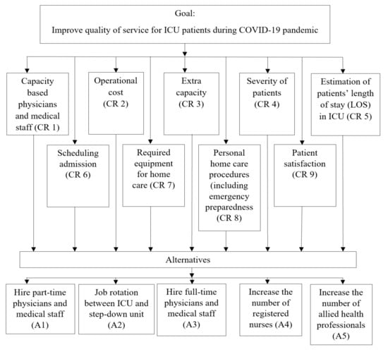 Researchers have been studying ICU service improvement since well before the COVID-19 pandemic struck. In one such study, Chaboyer et al. [26] implemented a series of managerial changes to redesign the operation of an ICU at an Australian hospital, including appointing a lead nurse to discharge patients from the ICU and developing a patient handover sheet containing the patient’s critical medical information. Their findings showed that these changes reduced the ICU patient discharge delay time from 4.6 to 3.2 h, while not affecting patient mortality rate [26]. In another study, McWilliams et al. [27] addressed the negative impact of using mechanical ventilators on ICU patients for prolonged periods by adding a supportive rehabilitation team to the ICU’s operations. Their findings showed that these changes improved ICU mobility and reduced both the number of ventilator days per patient and the mortality rate [27]. This sub-section clearly shows that ICUs are constantly in need of service improvements, and that these improvements require input from professionals from numerous different disciplines. A structured MCDM framework is one of the most effective tools for arriving at sustainable conclusions in group decision-making processes. In the next subsection, we identify the main inputs used in our model.