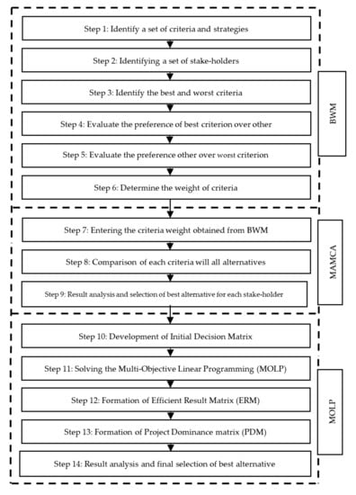 This proposed framework integrates the best–worst method (BWM) and Multi-Actor Multi-Criteria Analysis (MAMCA) with a Multi-Objective Linear Programming (MOLP) optimization model. Specifically, the BWM first assigns weights to all the criteria based on stakeholder input, and MAMCA is then used to identify the best alternative for each stakeholder group. Since the integrated BWM–MAMCA results only show the best-ranked alternative for each stakeholder group, but not the best common solution among all groups, an MOLP model is utilized to obtain a consensus solution.