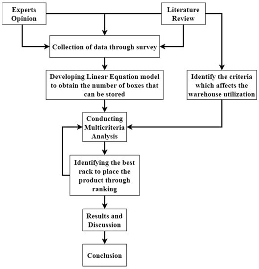 To achieve these objectives, this study integrates both the optimization- and MCDA-based methods. The dimensional data regarding the warehouse and product box are analyzed to formulate the LP model. The best possible solution from this model maximizes the quantities of the boxes stacked on the shelves within the facility. Furthermore, the type and number of products that can be placed on the shelves are defined. Then, the most suitable and effective placement for the product can be obtained through the decision-making tool, which is developed by integrating the rough AHP method with the rough TOPSIS method [