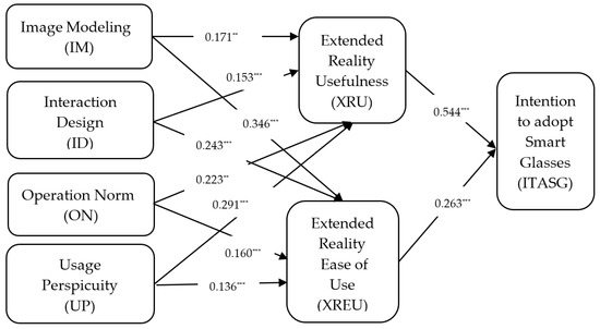 Standardized root means square residuals (SRMR) were used to evaluate the overall saturation of the XRTBM and the fit between the factors. The results showed that the saturation model was 0.022, while the estimated model was 0.058, both less than 0.08, indicating a good model fit [37]. The structural variance inflation factor (VIF) values assessed by the collinearity test were all between 1.5 and 2.3, below the threshold of 5.0 [45,46]. There was a highly correlated structure. The internal structure model was tested on a bootstrap subsample of 5000 with unsigned options using bias correction and the BCa bootstrap method. Differences were compared at the 0.05, 0.01, and 0.001 significance levels. The results of the PLS-SEM hypothesis tests are presented in Table 7 and Figure 3. For XRU, XREU (H1: B = 0.544, p; 0.001; H2 = 0.263 B, p; 0.001) was positively correlated with the hypothesized ITASG. Additionally, hypothesized ID, IM, ON, and UP had highly significant p-values for XRU, XREU, and ITASG, respectively, with p-values less than 0.01. Except for IM, UP values for XREU were slightly greater than 0.01, but all were less than 0.05, also consistent with good significant relationships.