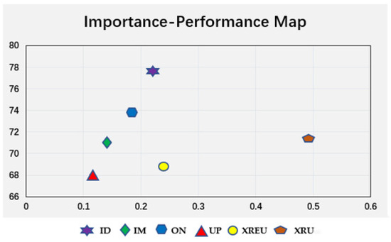 Importance Performance Map Analysis (IPMA) is a useful method in PLS-SEM to examine the average dimensionality of latent variables, path coefficients, and other reported standard results [39]. In other words, IPMA compares the overall effect of the structure with the mean scores of the latent variables. As seen in Table 11 and Figure 4, the overall effect is higher than 0.02. Additionally, XRU and XREU have a high positive effect on ITASG. From the performance point of view, all data are greater than 67, with ID being the highest, followed by ON, IM, and UP. the mean value of each variable is 67.952, which is at a relatively high level. This indicates that each variable has a direct impact on user behavior.