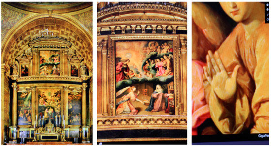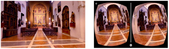 In our research, the objects produced in MR relate to the Church of the Annunciation in Seville, a building which belongs to the University of Seville. It was initially known as “Casa Profesa de la Compañía de Jesús” (Professed House of the Society of Jesu) and dates back to 1565. Its façade is one of the masterpieces of Sevillian Mannerism. The MR application developed allows the user to view, on a scoreboard, the 3D models of the carvings of St. Ignatius of Loyola and Saint Francis Borgia made by the sculptor Martínez Montañés between 1610 and 1624, which are located at the main altarpiece of this church. Additionally, users can access a gigapixel photograph of that altarpiece which, by means of an extreme zoom, they will be able to see each and every one of its details. Furthermore, it will be possible for any user to not only to experience a 360° viewing of the central nave, the entrance, and the crossing, but to also visualize a video of the central nave interior, recorded with the help of a drone (Figure 1).