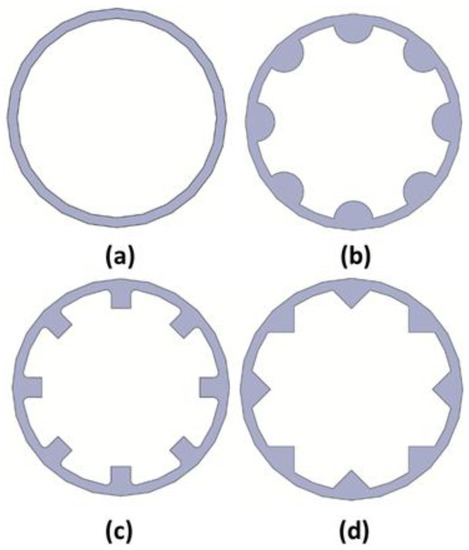 Figure 2 shows the different examined cross-sections of the examined tube. Figure 2a shows the reference case, Figure 2b the internally fined tube with circular fines, Figure 2c the case with rectangular fins, and Figure 2d the case with triangular fins. The height of every fin was selected at 2 mm, which is a reasonable value according to the selected diameter. Totally, 8 fins were selected for every case in order to use a relatively high number of fins in order to take a suitable percentage of thermal enhancement.
