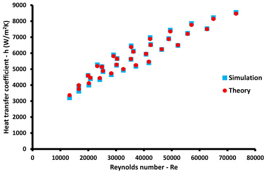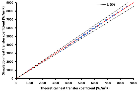 Figure 3 shows the heat transfer coefficient for different values of the Reynolds number. These points correspond to the cases with different mass flow rates (from 0.20 kg/s up to 0.35 kg/s) and to different inlet temperatures (from 290 K up to 360 K). The results are given for the theoretical case and the simulation analysis. It is obvious that the respective points are close to each other for the examined range of the Reynolds number. Figure 4 shows that the deviations are relatively low and are inside the error bar of 5%. Therefore, it is obvious that the maximum error is up to 4.95%, while the mean deviation is found at 1.2% which is a low value.