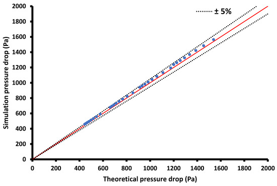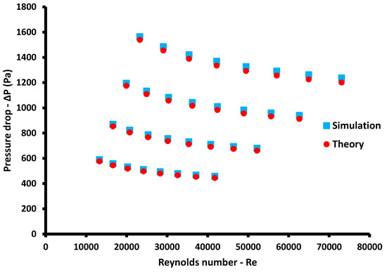 The next step is to check the results of the pressure drop. Figure 5 shows the pressure drop for the different investigated cases (combinations of different mass flow rate values and inlet temperature levels). It is clear that the found points between the theory and the simulation are close to each other. Figure 6 exhibits the deviations between the theory and the simulation, and it is obvious that the found deviations are lower than 5%. The mean deviation of the pressure drop is found at 2.54% which is a relatively small and acceptable value.