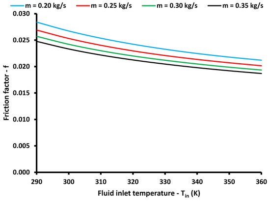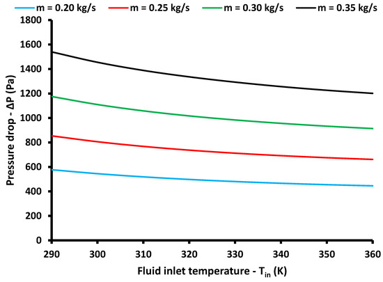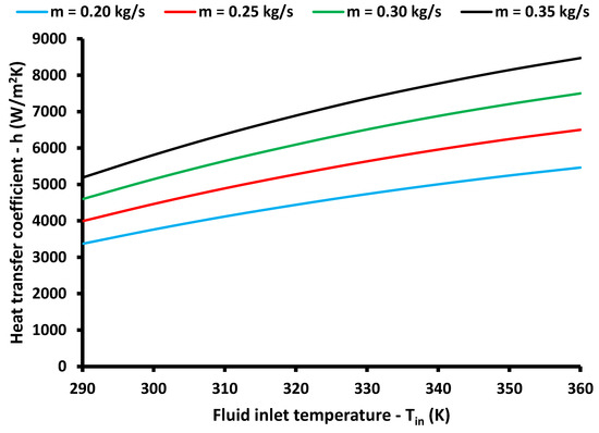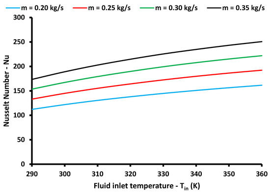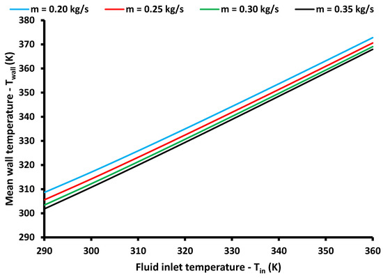The mean wall temperature is an important parameter which is depicted in Figure 13. This temperature level increases approximately linearly with the increase of the inlet fluid temperature. Moreover, it takes higher values when the fluid moves with a lower velocity, which means a lower mass flow rate. Practically, the lower mass flow rate makes the working fluid warmer (higher temperature increase), which leads to a higher wall temperature because the wall temperature has to be always higher than the fluid temperature. It is also notable that the curves of m = 0.30 kg/s and m = 0.35 kg/s are close to each other, which indicates that a higher mass flow rate would not lead to significantly different results.
