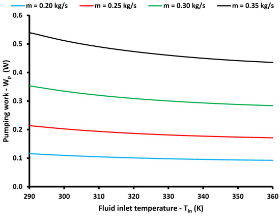 Figure 11 depicts the pumping work demand which takes generally low values compared to the heat input of 6281 W. The pumping work ranges from 0.09 W to 0.51 W. The pumping work demand is directly associated with the pressure drop, and thus it takes lower values when the temperature increases.