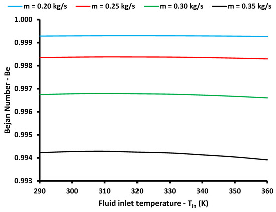 The Bejan number is an important index, which is depicted in Figure 12. This criterion is defined as the ratio of the generated entropy due to the fluid temperature increase to the total generated entropy. It has to be said that the total generated entropy includes the entropy generation due to both temperature increase and pressure drop. According to Figure 12, the Bejan number takes high values (over 99%), which indicates that the main reason for the entropy generation is the fluid temperature increase. Therefore, the application of thermal enhancement methods, such as the use of internal fins, is needed in order to enhance the heat transfer conditions and reduce the total entropy generation. It is notable to state that the Bejan number reduces a bit with the increase of the mass flow rate due to the higher pressure drop in these cases. Moreover, it has a very small decrease with the increase in the fluid’s temperature. This criterion is an important one in order to evaluate the impact of the pressure drop on heat transfer problems.