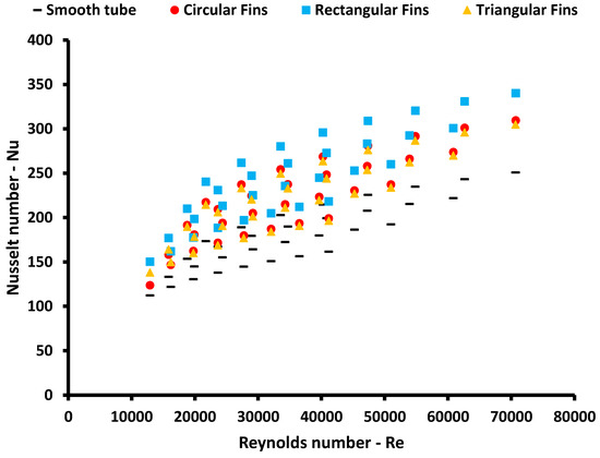 In the end, it is useful to discuss the present results with other studies from the literature. The present work uses 8 internal fins, and this number is correct according to the literature. Pai and Yeh [16] found that the internal fins are the optimum choice. Moreover, the present work found that the thermal enhancements with rectangular fins are around 36%, while the results of Reference [16] indicate enhancements of around 34% for a relatively low-pressure drop, so there is an agreement with this study. Moreover, it is very interesting that applying the suggested equations for the eight rectangular straight fins of Reference [21], the heat transfer enhancement is found again at 36%. Therefore, it is clear that the results obtained in this work are reliable and acceptable.