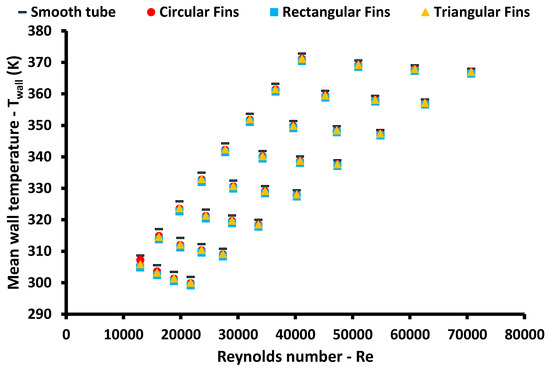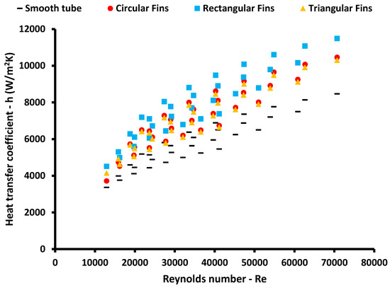 Figure 14 gives the results of the Nusselt number which is the main dimensionless number that describes the heat transfer phenomena. Moreover, the heat convection coefficient of the fluid, which is directly associated with the Nusselt number, is depicted in Figure 15. Both Figure 14 and Figure 15 indicate that the finned tubes lead to higher heat transfer rates from the tube to the fluid compared to the reference case. The use of rectangular fins seems to be the most effective design, while circular fins are the second one and triangular fins are the third one. The difference between the circular and the triangular fin cases is relatively low according to the results. Moreover, the enhancement margin seems to be higher in the cases with higher Reynolds numbers compared to the small Reynolds numbers.