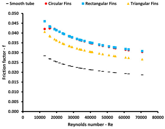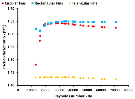 Figure 24 shows the variation of the friction factor ratio (f/f0) for the finned tubes. The rectangular and the circular fins lead to a higher friction factor increase of around 65% and 63%, respectively. The triangular fins lead to a 43% friction factor increase. Moreover, it is useful to state that in low Reynolds numbers, the circular fins lead to a lower increase in the friction factor.
