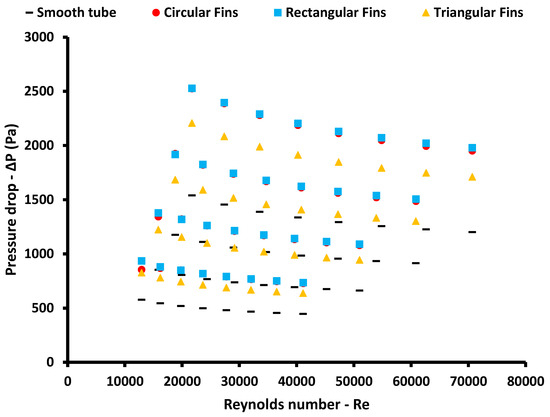- All the examined finned tubes lead to an increase in the pressure drop. The rectangular fins lead to a 65% increase, circular fins to a 63% increase, and triangular fins to a 43% increase, approximately, compared to the reference tube.