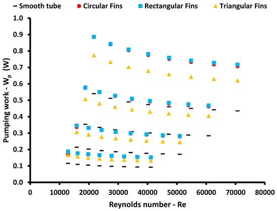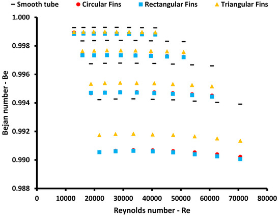The results of the friction factor are given in Figure 16, the pressure drop in Figure 17, and the pumping work demand in Figure 18. The friction factor shows clearly that the finned tubes lead to significantly higher friction losses compared to the reference case. The rectangular fins lead to the maximum friction factor with circular fins to follow with a very small difference. The triangular fins follow with a lower friction factor, while the reference empty tube has the lowest value of the friction factor. The results about the pressure drop and the pumping work demand show that the Reynolds number is not the only parameter that includes these parameters, and thus, there is a cloud of points. However, it can be said that in the respective cases, the use of fins leads to greater pressure drop and higher pumping work demand compared to the reference case. It could be said that the pumping work is about 60% higher with rectangular fins. Figure 19 depicts the results for the Bejan number which is over 99%. Therefore, the impact of the pressure drop on the system-generated entropy is not high in all cases. However, the Bejan number is lower for the finned designs compared to the reference case due to the higher pressure drop in these cases.