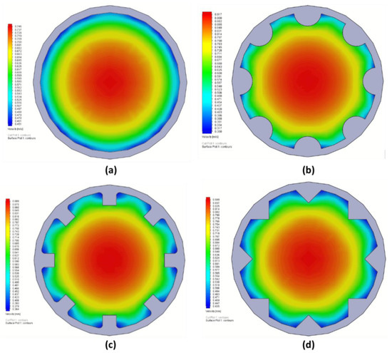 Fluid velocity in the outlet cross-section for the (a) reference empty tube [0.451–0.746 m/s], (b) tube with circular fins [0.300–0.917 m/s], (c) tube with rectangular fines [0.364–0.889 m/s], and (d) tube with triangular fins [0.435–0.849 m/s].