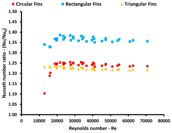 The last step in the present investigation concerns the evaluation of the Nusselt number increase with the simultaneous friction factor increase. Figure 23 shows that clearly the Nusselt number ratio (Nu/Nu0) is enhanced with the fins. The rectangular fins lead to 36% enhancement, circular fins to 25% enhancement, and triangular fins to 23% enhancement, approximately, compared to the reference tube. It is useful to state that in low Reynolds numbers, the circular tube leads to lower enhancements, which is considered an interesting result.