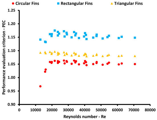 The last step is the proper evaluation of the aforementioned ratios of the (Nu) of the (f). The performance evaluation criterion (PEC) is used as a proper criterion for this purpose which has been defined in Equation (1). The results of Figure 25 show that the PEC is over 1 for all the cases, so there is flow enhancement in all the examined cases with all the finned tubes. This is an important result that indicates that the idea of using internal fins works for enhancing the flow totally. More specifically, the PEC is around 1.16 for the rectangular finned tube, 1.09 for the triangular finned tube, and 1.06 for the circular finned tube. Thus, the most appropriate design is the one with rectangular fins.