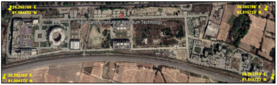 Route Determination and efficacy for RGIPT campus: The routing algorithm was also tried to be trained and tested over real LiDAR terrain data and used later for noise prediction using noise modeling. The terrain data were generated for RGIPT campus using Terrestrial Laser Scanner, point cloud data has an accuracy of up to ±3 cm (mentioned in Supplementary Section S2). RGIPT campus lies in between (latitude (26.265788), longitude (81.504372)) and (latitude (26.263355), longitude (81.515723)), as shown in Figure 2. The project site has an area of 0.33 km2. Adjoining the campus, there is a railway line, which is the primary source of noise pollution for the campus [35]. The locations for noise sources and receivers (destinations) in the RGIPT campus were ascertained. All the routes were determined between every pair or source and destination. Next, the terrain parameters were determined for every route and incorporated inside a noise propagation model for noise prediction. Efficacy of noise prediction was also tested with ground noise data for the campus.
