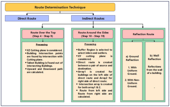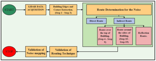 Different routes were determined, which described how noise propagated from various sources (car, bus, train, etc.) to reach different locations. They could travel through direct or indirect routes after diffracting (around the building), reflecting (from the wall) over different surfaces. The basic flowchart for routing determination is shown in Figure 4. In absence of building or obstructions between source of noise and its destination, the route was considered direct [37]. The terrain parameter for the direct route was considered to be the Euclidian distance between source and receiver. Indirect route determination processing steps are given below (Figure 4).