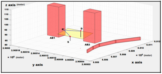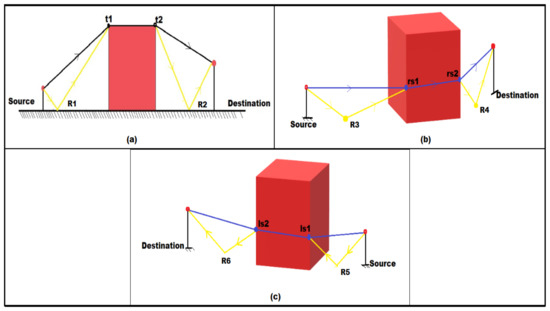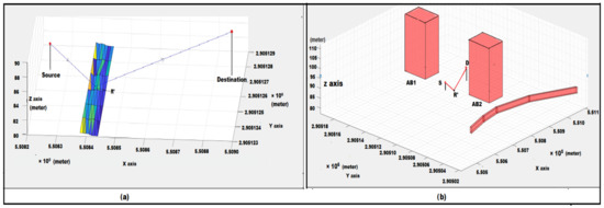 Authors understood the possibility of sound diffraction over the top of the building. The route that followed was for propagation of noise from source to destination over the top of the building. Initially, for the principal route finding, it was required to consider the positions of source and destination points and the building in between, as shown in Figure 6a [10] in a 3D coordinate access system.