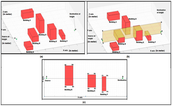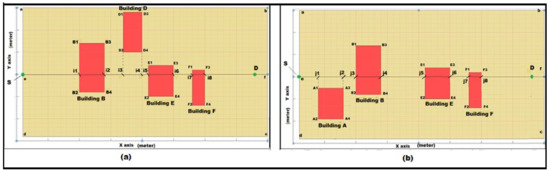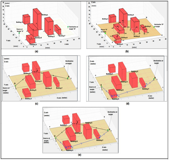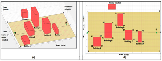 To understand the noise propagation, noise route determination was needed. A simulated area that consisted of a set of buildings was used for this purpose. The area contained buildings A, B, C, D, E, and F, which were of different heights and orientations. The area also contained a pair of source and destination points. The simulated area is shown in Figure 6a.