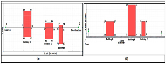 (a) (i1, i2), (i3, i4), (i5, i6) are the intersecting points found after the intersection of plane XZ (between S and D that has shown in the previous figure) with Building B, Building E, Building F denoted by (\). (Values in x and y-axis are in meter). (b) This line j1 to i1 denotes the height of the Building B edge denoted by O1. Similarly, for other edges (j2–i2), (j3–i3), (j4–i4), (j5–i5), (j6–i6) the heights are O2, O3, O4, O5, O6. The source is denoted by “S” and Destination is denoted by “D”.