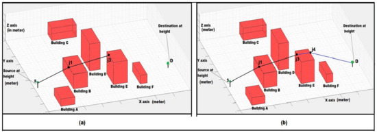 (a) Route from Source(S) –j1–j3 is an upward travel path where j1 and j3 are the height points of intersection point i1 and i3 with respect to height of buildings denoted by (●). (b) Route from j3–j4–D (Destination) is a downward travel path where j3 and j4 are the height points of intersection point i3 and i4 with respect to height of buildings denoted by (●).