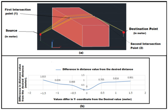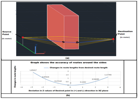 (a) “1” is the first intersection point moving from source to destination around the sides of the building. Similarly, “2” is the second intersection point. The blue route is the desired route from the algorithm and the rest yellow routes are the deviated routes, when the first intersected point has shifted value upward and downward in the Z direction. (b) Graph shows the accuracy of the route around the sides.