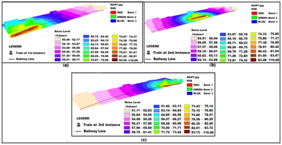 RGIPT campus noise map for noise source points at railway line when train is at different location and the noise receiver points (destination) are all over the RGIPT campus including buildings of different height. (a) 1st instance, (b) 2nd instance, and (c) 3rd instance.